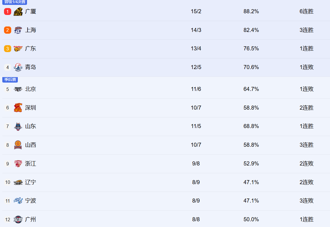 浙江、辽宁、宁波和广州排在9-12。浙江已经两连败了,相比于之前的强势崛起,最近有点放缓了。辽宁也是两连败,他们的核心问题还是出在得分点太少了,即便赵继伟复出也无法盘活全队。宁波则遭遇三连败,国内球员得分能力太差了。广州则在保持紧咬,这轮还大胜了北控。