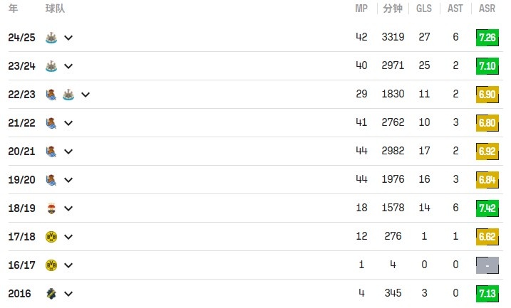 近两季在纽卡,他交出了40场25球、42场27球的亮眼数据,效率惊人。